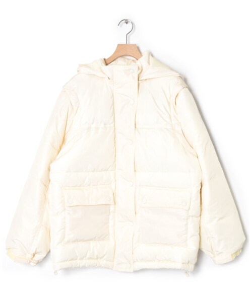 軽くて暖かいのが魅力的な冬マストアウターカジュアル派の定番アウターといえばエコダウン。ボリューミーなシルエットながらにすっきりとしたボディラインががカジュアルながらも可愛らしい一着。中綿入りで、軽量ながらもしっかりと体を暖めてくれます。袖にゆとりがあるのでニットや厚手のスウェット地の上にも羽織りやすいのが嬉しいポイント。袖の取り外しができるのでダウンベストとして雰囲気を変えていただけます。カラーは定番のオフホワイト、ブラック。コーデのポイントカラーとなるオレンジに、ナチュラルテイストなトレンドコーデが楽しめるサンドベージュをご用意いたしました。スタイリングカジュアルアイテムからガーリーまで幅広いアイテムと相性◎です。後ろにずらして抜き襟っぽく着るとラフな雰囲気になりオシャレ。ワイドパンツやリブパンツと合わせてトレンドライクに着こなしても◎。デニムと合わせて定番のカジュアルコーデもオススメです。ワンピースやフレアスカートなど女性らしいアイテムと合わせても可愛い。※商品の色はimageの着用写真ではなく、商品写真をご参照ください。