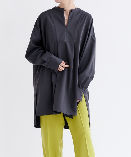 \甘さを抑えたデザインで大人な1枚/ゆとりのあるシルエットと、きっちり感のあるデザインのバランスがかわいいブラウス。 たっぷりと取った身幅に、大胆なサイドスリットと前後差のある丈感でこなれ感たっぷりのデザインが魅力。一見、シンプルなブラウスですがバックスタイルはボタン開き仕様で、後ろ姿を優美に演出。ボタンを開けて後ろスリットにし、動きのあるバックスタイルを楽しむのもオススメです♪1枚ではもちろん、寒い日には中にタートルネックを重ね着したスタイルも◎春まで長く使えるアイテムです。スモーキーなくすみカラーの3色展開も注目ポイントの一つ。 ********************* ・胸元のクラシカルなデザインがきっちり感を演出 ・バックスタイルはボタン開き使用!! ・着になる部分を自然にカバーしてくれるゆったりサイズ ********************* 【 ♡ をクリックでお得な情報をお知らせいたします 】 〈 商品のお気に入り登録 〉 お気に入りアイテムのお値下げ・再入荷・在庫ラスト1点など通知を受けることができます。 〈 ブランドのお気に入り登録 〉 DOUDOUの新商品や再入荷、セール、クーポン配布などお得な情報を受けることができます。 -------------------------------------- ※ 掲載画像の商品の色味は、 撮影場所や光の当たり具合などにより色味が異なって見える場合がございます。 また、お客様のお使いのPC・スマートフォン等のモニター環境などにより色味が異なって見える場合がございます。予めご了承の上ご注文ください。 ※着用、お取り扱いの際は、商品についている品質表示とアテンションタグを必ずご確認下さい。