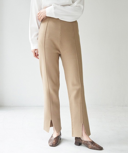 トレンドのニットアップが手軽に楽しめる! DESIGN ・センターシームとスリットで、きちんと見えするニットパンツ。 ・フィット感のあるリブ編みのウエスト。 FABRIC ・アンチピリング加工の糸を使用していて、毛羽の立ちにくい滑らかな素材。 ・肉厚の編地でボディラインを拾いにくい。 COLOR/COORDINATE ・基本のブラックに加え、ナチュラルカラーをそろえた4色展開。 ・同シリーズのニット(GDM50600、GDM50610)とセットアップでの着用が可能。 ・・・・・・・・・・・・・・・ 裏地:なし 透け感:なし 伸縮性:あり 生地感・厚さ:やや厚手 ポケット:なし 季節:秋~春、冬はニットと、春はブラウスなどとの合わせがおすすめです。 ※撮影時の光、お使いのモニター環境によって色の見え方が違う場合がございます。