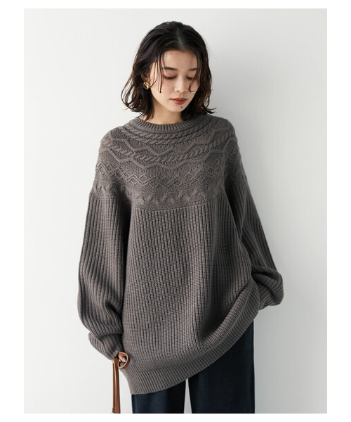 求心柄編みが優しげな雰囲気を醸し出すニットプルオーバー。 ゆったりシルエットが、気になるラインをカバーしつつ華奢な印象に見せてくれる効果も。ふっくらボリュームを加えたスリーブデザインも、女性らしさをいっそう引き立てます。 単色でコーデに取り入れやすく、デイリーのスタイリングに重宝するおすすめのアイテムです。