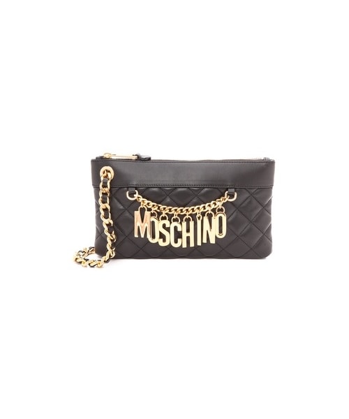 Jingling 'Moschino' letter charms add a playful touch to a slim Moschino clutch, rendered in quilted leather. The zip top opens to a lined interior with 1 card pocket, and leather ribbons thread through the chain wrist strap. Gold-tone hardware. Dust bag included. Leather: Sheepskin. Weight: 14oz / 0.4kg. Imported, Hungary. Measurements Height: 6in / 15cm Length: 10.75in / 27cm Depth: 1.25in / 3cm