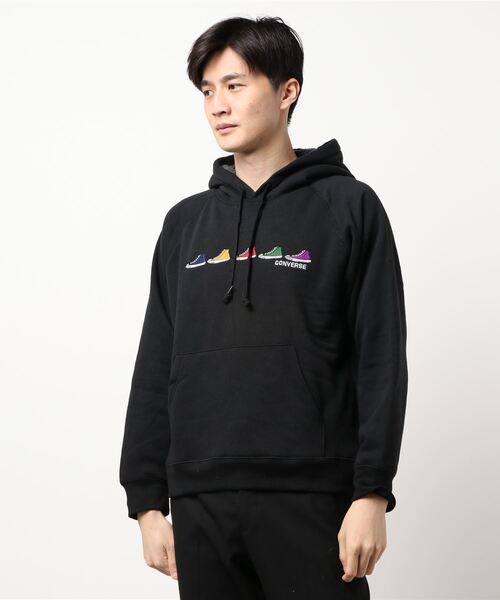 裏地にボアを使用、胸には5色のコンバーススニーカー刺繍を施した、暖かなコンバースの裏ボアプルパーカースウェット。