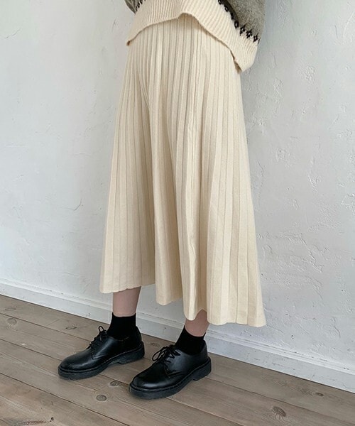 冬らしい暖かみのあるニットプリーツスカート◎ 低身長さんにぴったりの丈感でスニーカーやショートブーツとの相性も抜群です。 シンプルで合わせやすい3色展開。