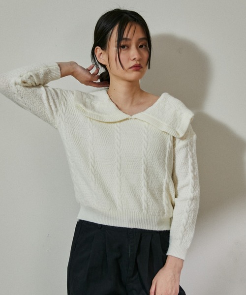 大きな衿のケーブルニットプルオーバー大きな衿と後ろのリボンが目を引く、ケーブル編みのニット。【STYLING】ふんわりとした糸を使用しており温かさも抜群です。1枚で着ても、インナーにタートルネックやブラウスを合わせてもOK。大きすぎないちょうどいいボリュームなので、ボアブルゾンやファーコートのインナーにも使えます。ボトムには、デニムやフレアーパンツ、プリーツスカートを合わせるのが◎フェミニンっぽくもカジュアルにもマルチなスタイリングが可能です。小物には、ファーのBAGなどがオススメです。【色展開】・オフホワイト(白、白色) 柔らかな印象の使いやすい色。・グリーン(緑、緑色) 深みのある大人カラー・ブラウン(茶、茶色) カジュアルなスタイリングに相性抜群。【お買い物をもっとお楽しみいただくために】▼商品のお気に入り登録▼完売カラーの再入荷通知や、ラストと1点の通知、プライスダウンしたセール通知も受け取ることができます。▼ブランドのお気に入り登録▼新作や再入荷等、いち早くブランドのお得な情報を受け取ることができます。