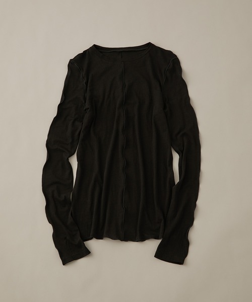 薄手で重ね着もしやすく、簡単にトレンドが手に入る旬顔ロンT【Material】 肌触りが良く、ふわっとした素材感のコットン天竺。着心地が良くやみつきになる一枚です。 【Design】 前後中心と袖に施した、今年らしいメローのラインが際立つシアートップス。ほどよい透け感でカジュアルな中にも女性らしさを演出してくれます。絶妙なゆるさが可愛く、長めの袖をクシュクシュさせるのがおすすめの一枚です。定番ブラック・ホワイト、今年らしいグリーンの3色展開。 【Styling point】 デニムとのシンプルなスタイリングでも、今っぽさをプラスしてくれます。汎用性が高く一枚でもレイヤードしても使えるので、シーズンレスにご愛用いただけます。 ----- 透け:あり 裏地:なし 伸縮性:あり 光沢感:なし 生地の厚さ:薄い ポケット:なし 洗濯方法:手洗い可 ----- ※画像の商品はサンプルです。お届けする商品に仕様・サイズ等の変更が生じる場合がございます。予めご了承ください。 ※ロケ撮影画像は、光の当たり具合で色味が異なって見える場合がございます。商品の色味は、スタジオ撮影の画像をご参照ください。