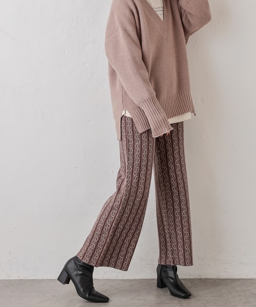 【2020AW natural couture】コーデの鮮度が上がる、小紋柄パンツ 秋冬らしい小紋柄のジャカード織りが特徴のリラックス感漂うニットパンツ。 ヴィンテージ感漂うクラシカルな総柄が一際目を引くアイテムです。 太すぎないシルエットと生地の程よい厚みでレッグラインを すらっと綺麗に見せてくれ、総ゴムのウエストがイージーな着心地を叶えます。 シンプルなトップスと合わせるだけでも一気にトレンドライクになり、 パンツとしてだけでなく、ワンピースの下にレイヤードして裾だけ見せるのもおすすめ◎ 目が詰まったジャガードニットを使用しているのでロングシーズン着用していただけます。 カラーは合わせやすい、アイボリー、グレー、ブルーの3色ご用意しました。 ========================= 透け感:なし 裏地:なし 伸縮性:あり 光沢感:なし 生地感:程よい厚みの生地感 =========================