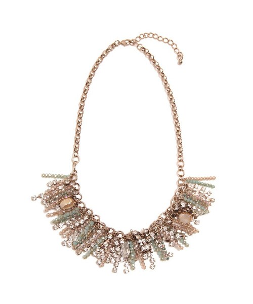 グレイッシュトーンのビーズとラインストーンのフリンジネックレス。