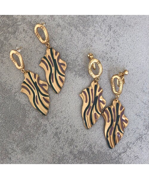 アンティークなデザインが大人らしさを加えてくれるアイテム。 ゴールドカラーでしっかり存在感はありつつも、くすんだグリーンとパープル色が大人の印象を与えてくれます♪ 見える角度で表情変わり、ウェーブの曲線が柔らかく女性らしい印象に◎ ピアスとイヤリングをご用意致しました。 着け心地も軽く、デイリーシーンにはもちろんのこと、パーティーシーンにもぴったりなデザインです。 ◾️クリックポストにて代引きをお選び頂いた方は、390円プラスさせていただき、宅配便代引きにて発送させていただきますのでご了承下さい。 ◾️カラー ゴールド ◾️サイズ 縦:約7cm 横:約2.5cm 重さ:約5g ※多少の誤差は予めご了承ください。 ◾️素材 合金