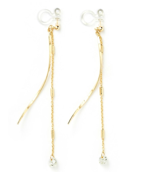 華奢なスティックとチェーンが揺れて、視線を集める。 チェーンの先にクリアビジューをあしらって、上品な輝きをプラス。 普段使いからフォーマルシーンまで幅広く使えるアイテム。 ★素材の特性上、カラーが、写真と多少異なる場合があります。