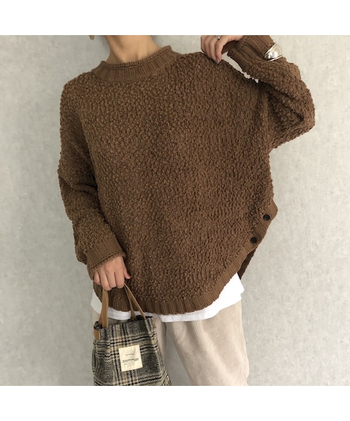 優しいフェミニンな印象のサイドボタンデザインニットプルオーバー。 小さなポップコーンが付いたようなふわっとした素材感で、着るだけで可愛くなれるアイテム! サイド部分のボタンデザインが大人っぽい雰囲気もプラスしてくれます◎ ルーズなサイズ感に、裾はラウンドになっており気になる部分もカバー! どんなボトムスとも合わせやすい丈感で着回し力も抜群です。 ※モデル身長:161㎝ ◾️カラー アイボリー・ブラウン ◾️サイズ 着丈68cm 身幅65cm 裾幅68cm 肩幅72cm 袖丈38cm ※多少の誤差は予めご了承ください。 ◾️素材 アクリル100%