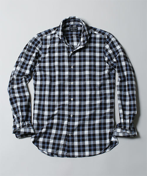 ◆GUY ROVER◆(ギ・ローバー)『上品で美しいシルエットが魅力の1枚』1967年、イタリアはピアツェンツァにて創業されたシャツブランド『GUY ROVER』。オールマシンメイドのシャツでは最高峰のクオリティを誇ることで知られています。こちらは落ち着いた配色が上品な印象のチェックシャツ。着丈がやや長めで、細身のシルエットが特徴です。釦を外しても衿が遊ばず美しいカラーシルエットを保つホリゾンタルカラーも魅力です。modelH180 B86 W70 H86 着用サイズ:MEDIUM