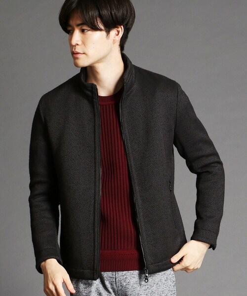カットソーのヘリンボンジャガード素材を使用したショートスタンドブルゾン。表地のストレッチ性を損なわせない為、裏地は全面ストレッチ裏地を使用。袖の設計を調整し、人体の構造に沿うようにする事でより着やすくしております。ファスナーにはエナメルの様な特殊なメッキを施したものを使用し高級感を出しました。表地のヘリンボンジャガード素材は立体的な表面感と柄感が特長。ウールよりも軽く、カットソーの様によく伸びるのも魅力の素材です。裏面を起毛加工している為、起毛部分に空気が溜まり、暖かく着用頂けます。 ※画像の商品はサンプルです。実際の商品とは仕様・加工・サイズ・素材が若干異なる場合がございます
