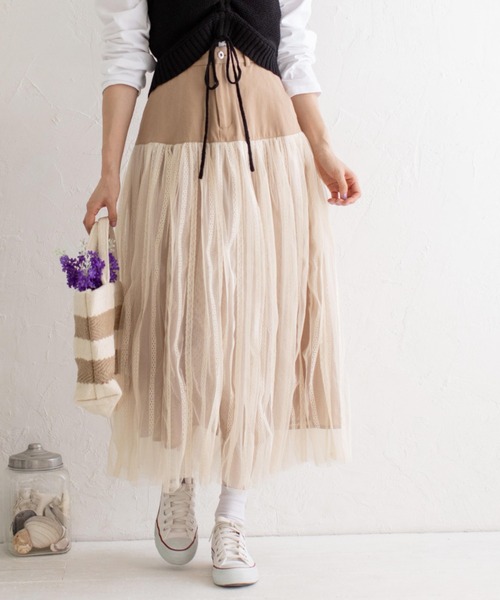★ウエストヨーク★異素材ドッキングスカート<DESIGN>適度な肉感と程良いギャザーフレアで足元を綺麗に見せてくれるドッキングチュールレーススカート。エアリーなレースが別動きのある女性らしい素材とデザインです。ウエスト部分がヨークになっており、タックインするとスタイリッシュに。腰回りの生地が綿100%のしっかりした生地感なので、気になる腰やお腹周りにアプローチしてくれます。重ね着できになる、チュールの膨張もさりげなくカバーできる、ドッキングスカートです。スリットの入ったロングワンピースなどと合わせると、部分的にレースが見えておしゃれに★コンパクトなニットやブラウスをタックインで合わせてスタイリッシュな大人ガーリーにも、オーバーサイズのニットやトレーナーを合わせてゆるコーデにもおすすめです。<CARE>※詳しくは製品に付属している洗濯表示をご参照ください。※撮影環境により、多少実際のカラーと異なる場合がございます。 また、携帯やスマートフォン、パソコンなどの画面上と実物では多少色が異なって見える場合がございますのでご了承ください。★商品のお気に入り登録 登録すると、完売しても再入荷時に通知を受け取ることができます。 ほかにもお得な特典があるかもしれません♪ ★ブランドのお気に入り登録 新商品や再入荷などの情報を受け取ることができますので、是非ご登録ください♪