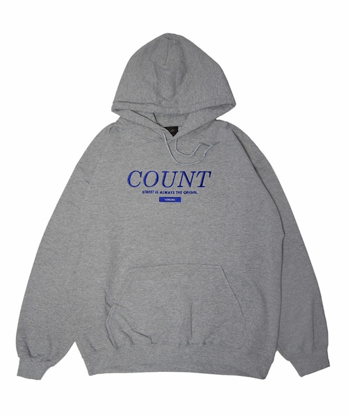 COUNTと刺繍されたパーカー。”出発”をイメージした刺繍の文字は、シンプルなストリートウェアらしいデザインとなっております。 8.0オンス(裏起毛)のパーカーはアウターを羽織りやすい厚さで、一枚でもインナーとしても着やすく長いシーズン楽しめるアイテムです。