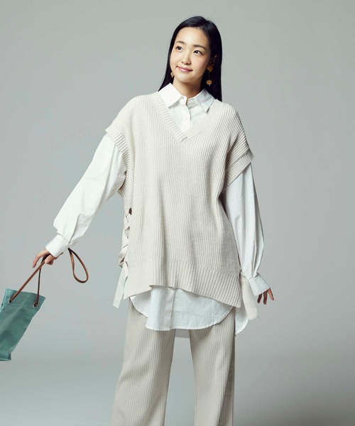 ライトオン オリジナルブランドHONEYSUCKLE ROSE(ハニーサックルローズ)のレースアップベスト前シーズン大人気だったニットベストをざっくりニットで春用にアップデート!トレンドのゆったりシルエットで、サイドを同素材のリボンでレースアップし、さらに深いVネックにすることで女性らしい仕上がりにしました。ビッグシルエットのTシャツやシャツと重ね着するとイマドキ感のあるスタイリングに! また、ゆったりとした身幅とサイドのデザインが効いているから、いつものTシャツやトップスに重ねるだけでも着こなしをバージョンアップきます。※比較的粗大きめの編地で、少しドライな肌触りが、清涼感を感じさせます。