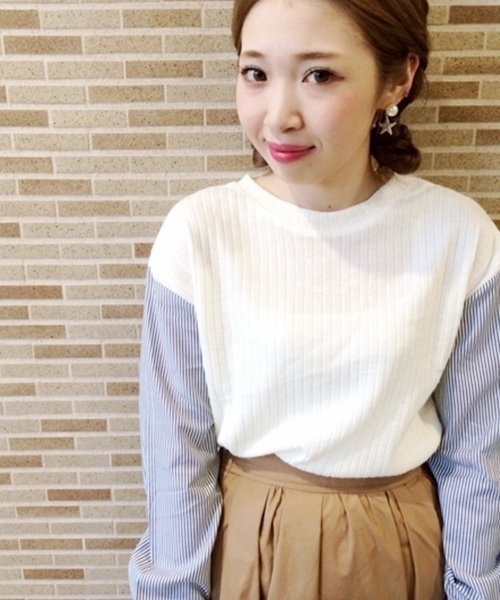 who's who Chico(フーズフーチコ) 袖をシャツの異素材で切り替えたトップス。毛羽立った素材感がこれからの季節に使いやすく、1枚で存在感のあるアイテムです。サイズもコンパクトサイズなので、インしてもアウトで着ても◎色にあわせて袖の柄も違うので、お持ちのお洋服でお好きなカラーをチョイス♪