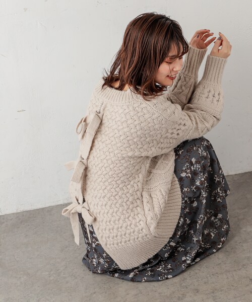 【2021SS natural couture】2021SSの注目アイテム◎後ろリボンがキャッチーなケーブルニット【WEB限定:ピンクベージュ】ローゲージのざっくりとした風合いと、見る角度で表情が異なるケーブル編み模様など、デザイナーが細部にこだわった、主役級ニットです。後ろリボンが目を引くデザインだけでなく、前身頃もしっかりとした編地に仕上げ、着るだけでお洒落度と女子力がアップすること間違いなしの1着。背中の開き部分は、ホックで開閉自由となっており、お好みで肌見せやレイヤードスタイルを楽しんで頂けます。カラーは、肌馴染みの良いあたたかみのあるくすみ色の、オフホワイト、チャコール、モカ、ミント、ピンクベージュの5色展開でご用意しました。=========================透け感:なし裏地:なし伸縮性:ややあり光沢感:なし生地感 :しっかりとしているが、身体馴染みが良い=========================1211