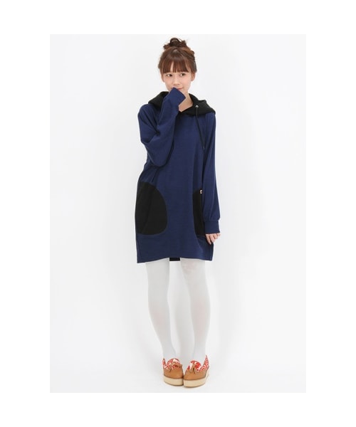 肌触りのよい素材を使用したワンピース。ニットの様な2種類の素材をドッキングしたデザインがアクセントに。耳モチーフがついたフードがポイント。Torso:H163.5 B80 W58.5 H86 着用サイズ:01サイズ