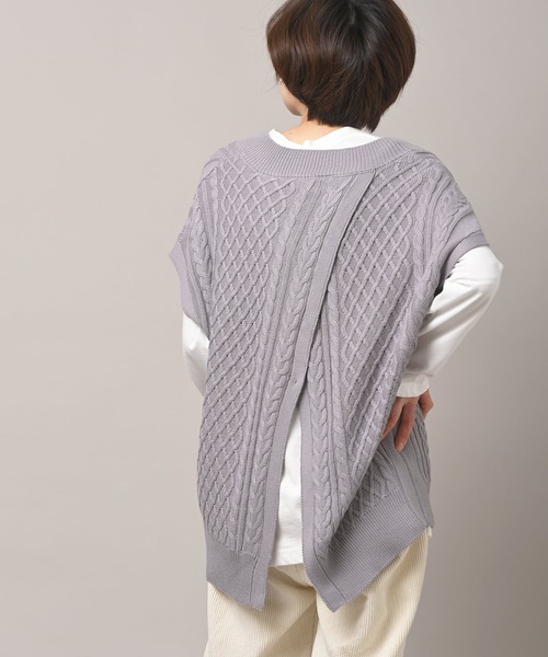 オーバーサイズでおしゃれ見え♪ケーブルニットベスト ゆったりとしたサイズ感がおしゃれなニットベスト。 ケーブル編みがシーズンライクなトレンドコーデを演出します。 ドロップした肩のラインが抜け感のある女性らしい印象に。 縦長のVネックが全体をすっきりとまとめてくれます。 また丸首のカットソーでも襟付きのシャツやブラウスでも合わせやすいデザイン。 後ろは斜めに重ねてスリットを施してアシンメトリーに仕上げました。 スタイリングを今年らしく仕上げてくれるくすみカラーの色展開も魅力♪ 裏地なし 伸縮性なし 薄手 編み加減や染めの具合でデザインやサイズ等異なる場合もございます 洗濯:手洗い可