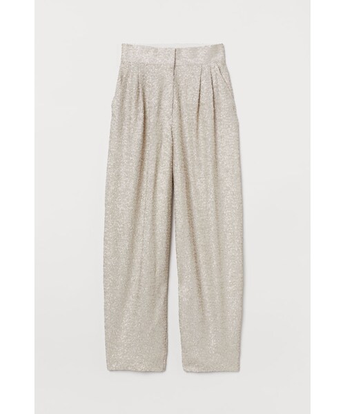 スパンコールを施したリサイクルポリエステル製メッシュ素材のパンツ。ハイウエスト。かぎホック留めで、ジップフライ。斜めサイドポケット付き。バックにフェイクポケット1つ付き。股の部分がやや低めのロークロッチタイプ。ウエストタック入りで、裾に向かってゆるやかに細くなるワイドレッグ。リサイクルポリエステル製ジャージー素材の裏地付き。