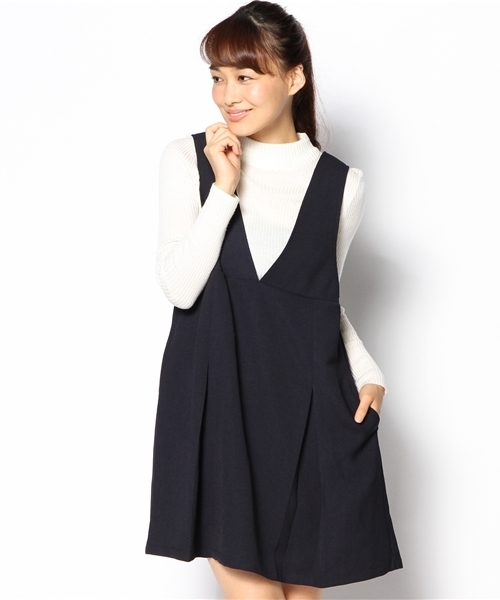深めに開いたネックデザインがポイントのジャンバースカート。ハイネックやブラウスを合わせるのがお勧めです!ふんわりした裾はフェミニンな印象に仕上げてくれます。