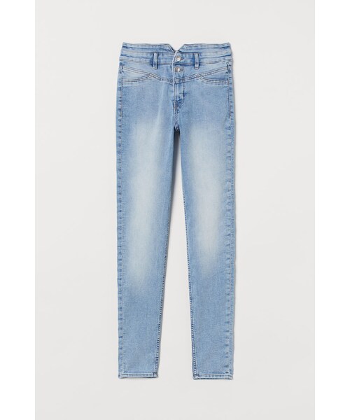 スーパーストレッチデニムを使用したジーンズ。フロントとバックにカットアウトを入れたハイウエスト。ウエスト近くにシームを施したデザイン。ボタン2つ付きで、ジップフライ。バックポケット付き。スリムレッグ。