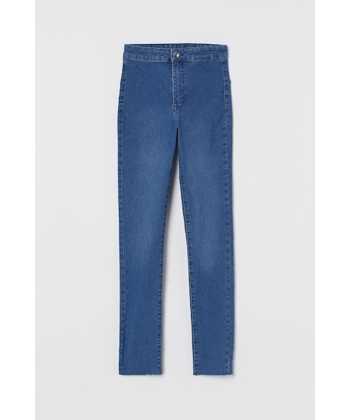 ウォッシュ加工のスーパーストレッチデニムを使用したハイウエストジーンズ。ボタン&ジップフライ。バックポケット付き。スキニーレッグ。