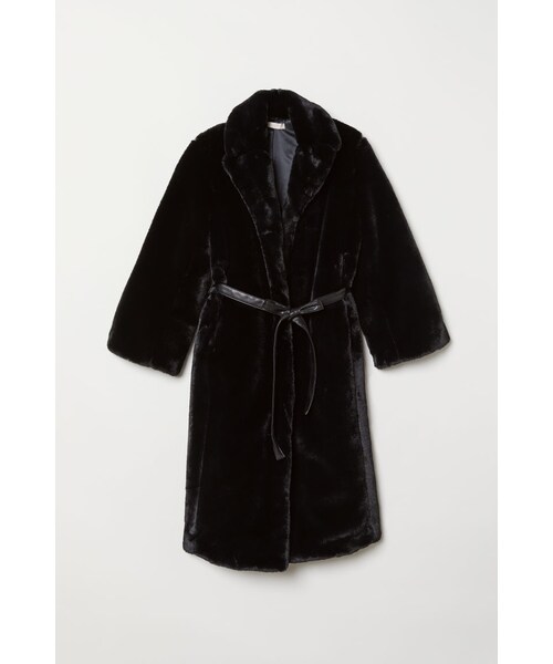 ソフトなフェイクファーのコート。ノッチラペルが付いたデザイン。フロントはかぎホック留め。サイドにシームポケット付き。取り外しできるフェイクレザーのタイベルトが付いています。裏地あり。