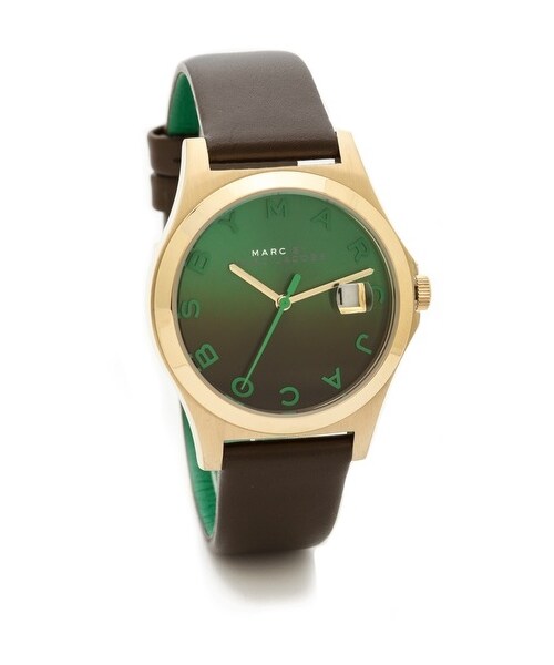 Logo letters mark the bright, gradient dial of a gold-tone Marc by Marc Jacobs watch. A petite date window details one side. Leather band. Hinged-snap clasp. Water resistant to 50 meters. 2-year manufacturer warranty. Imported, China. Measurements Dial: 1.25in / 3cm Band: 0.5in / 1.5cm Length: 5.75-7.5in / 14.5-19cm