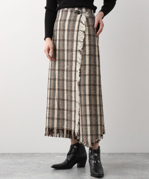 先染めチェック生地のラップ風スカート太番手の糸でざっくりとした風合いで織った先染めチェック生地を使用。冬らしいウォーム感のある雰囲気に仕上げました。アシンメトリーなラップ風のデザインと素材を生かしたフリンジディテールがポイント◎冬にピッタリなスタイリングの主役になる一枚です。※撮影環境により、光の当たり具合で色味が違って見える場合があります。あらかじめご了承下さい。