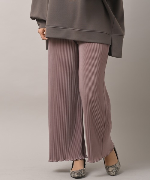 ニュアンスたっぷりな細プリーツのワイドパンツ 細かいプリーツが揺れるたびに繊細な表情を魅せるワイドパンツ。 生地にはほんのり光沢もあり華やかな雰囲気も湛えます。 テロっとしたカット生地が作りだすしなやかなストレートラインも魅力。 裾はメロウ仕上げでフェミニンな足元を演出します。 ウエストは総ゴムでリラクシーに。 パンツとしてはもちろん、レギンス感覚でレイヤードスタイルにもピッタリな1枚です。 ライトベージュのみ裏地あり 伸縮性なし 薄手 ウエスト総ゴム ウエストリボン入り(調節可) 洗濯:手洗い可