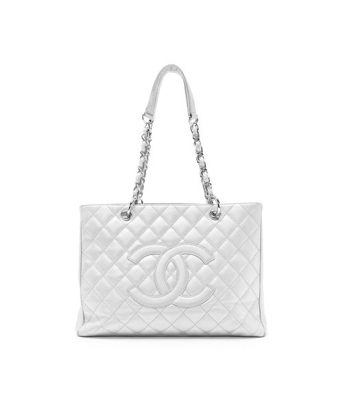 Pearlescent pebbled leather composes this authentic vintage Chanel handbag, which is detailed with signature quilting and interlocking Cs at the front. A slim pocket accents the back. Leather-woven, silver-tone chain handles. The lined interior includes a dividing zip compartment and 2 pockets. Leather: Calfskin. Weight: 48oz / 1.36kg. Made in Italy. Measurements Height: 8in / 20.5cm Length: 13in / 33cm Depth: 5.5in / 14cm Handle drop: 10in / 25.5cm