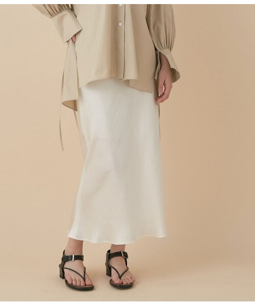 ◇2021春夏◇ADAM ET ROPE' FEMME【Material】肉厚な光沢のサテン。ナチュラルなワッシャー加工がデイリーでこなれ感のあるサテンです。クリーンなイメージのホワイト、ベージュ、カーキの3色展開。【Design】腰回りはすっきりしており、裾部分がフレアになっているマーメイドシルエットのスカート。気になる体型をカバーしつつ、女性らしく見せることができます。シンプルなトップスに合わせるだけでコーディネートをワンランクアップしてくれる一枚です。【Styli