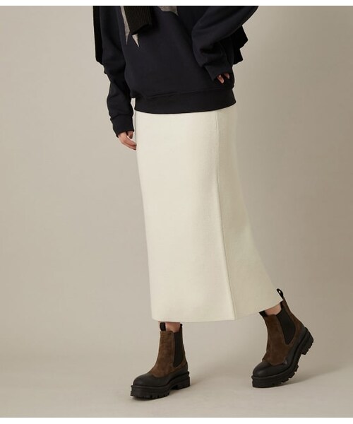 【Material】ウールナイロン混のスムース編み。しっかりと厚みがあり、高級感ある素材です。【Design】スリット入りで細見えするIラインのロングスカート。肉厚な素材なので、身体のラインを拾いにくくすっきりとした着こなしを叶えてくれます。前後2WAYで着用していただけるので、その日の気分によって変えられるのも嬉しいポイント。【Styling point】足元に重めのブーツを合わせると、より今年らしい着こなしに。カジュアルにも綺麗目にも幅広いスタイリングを楽しんでいただける万