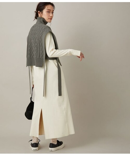 【Material】◇ベストふっくらとしたコットン/アクリルの糸を多本取りした、立体感のあるケーブル編み。◇ワンピースしっかりとコシのある、透けにくいリブ素材。【Design】◇ベスト長めに垂らした両脇の総針テープや、動きを出した裾のスリット等、細かなディティールにこだわったハイネックのケーブルベスト。◇ワンピースきれいなシルエットにこだわったIラインワンピース。バックネックのスリットや、袖口のフィンガーホールがポイント。全体的に3本針を入れ、きれいめになり過ぎない