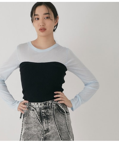 ◇2021春夏◇ADAM ET ROPE' FEMME【Material】強撚のコットン糸を使用したドライタッチとシャリ感が特徴のリブ編みニットです。【Design】ジャストフィットで着用していただける、リブのニットベアトップです。1枚で素肌に、Tシャツなどカットソーにレイヤードしてベスト感覚でプラスしていただくと鮮度が上がるアイテムです。上端の肌側に、滑り止めテープが付いているので安定した着用感を叶えてくれます。【Styling point】ジャケットのインでちら