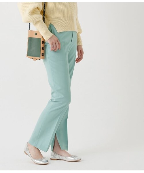 【Material】オーストラリアで激選された羊毛を使用した梳毛の平織り素材。ウール本来の柔らかさを保った状態で織られているため、密度がありキレイ面でありながらしなやかさのある高品質素材です【Design】ひざ下からややフレアシルエットに見える脚長効果のスラックスです。足元合わせが楽しくなる裾のスリットディティールで、こなれ感をプラス。センタープレスなので、脚をより細くすらっと見せてくれます。ウエスト部分はきちんと感がありながら、後ろはゴムで楽ちんな仕様に。いつもより自分の脚が好きになれそ