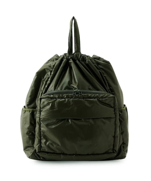 上部の紐を引っ張ることで開閉できる、ナップサックの様な構造のバッグ。コーディネートに合わせて、トップの持ち手を使ってトートバッグの様に使用することも可能。表地は、小雨程度なら安心の防水性に優れたマイクロリップを使用。内側の背面には、メインの収納スペースとは別に17インチまで収納できるPCスリーブを装備。緩衝材を使用しているため、背負った時にクッション性があり、パソコンもしっかり保護できるので安心。また、大きめのアウトポケットがあるので、使う頻度が高いものもたくさん収納できる便利な構造も魅力。両サイドに