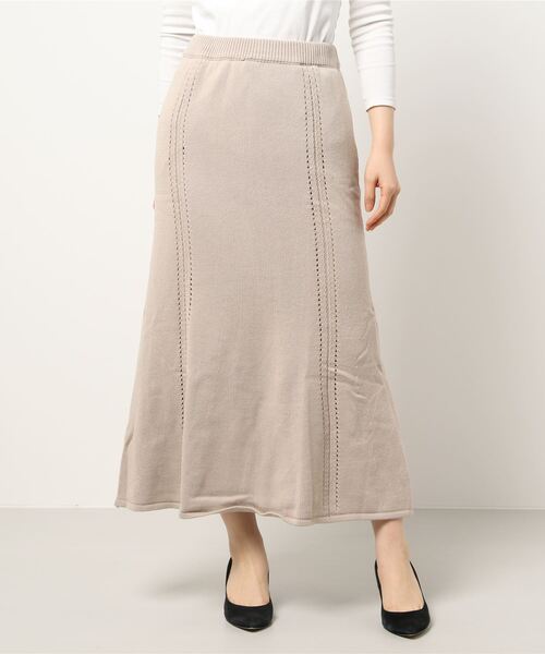 マーメイドのラインが美しいシルエットを叶えるニットスカート。腰周りは、すっきり仕上がるので、トップスとのバランスが取りやすいのが魅力的。トレンドライクな着こなしに仕上がるコクーンスリーブカーディガン(ブランド品番:C5118)とのセットアップスタイルもオススメ。【素材・サイズ感】肌に優しい綿100%のニット素材を使用。裏地付きで安心して着用頂けます。ウエストはゴムで、快適な穿き心地。マーメイドラインですが、裾は広がっており、動きやすさ◎