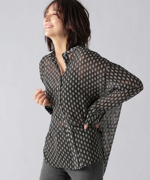 ◆DETAILポイントバンドカラーがメンズライクでモードな印象のブラウス。ボディーの素材を透け感のあるシフォンで女性らしさもプラス。透け感のない同柄のビスチェは、上からレイヤードしたりブラウスの中にレイヤードしたりお好みでお使いいただけます。◆FABRICポイントシャツは透け感のあるシフォンのリーフ柄を使用。レイヤードのビスチェには、透け感の無い同柄のデシン素材を使用しています。モノトーンで落ち着いた印象の、大人っぽいリーフプリントです。