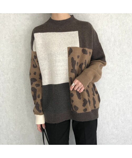 色や柄使いなど遊び心を感じるおしゃれニットです。 レオパードとスクエア柄がフロントやバック部分に施され、どこからみても表情豊かな可愛いニットです。 あたたかみのあるもっちり素材で伸縮性もありゆったりとした着心地。 ロングスカートやパンツスタイルでもスッキリと着られる主役級アイテムです★