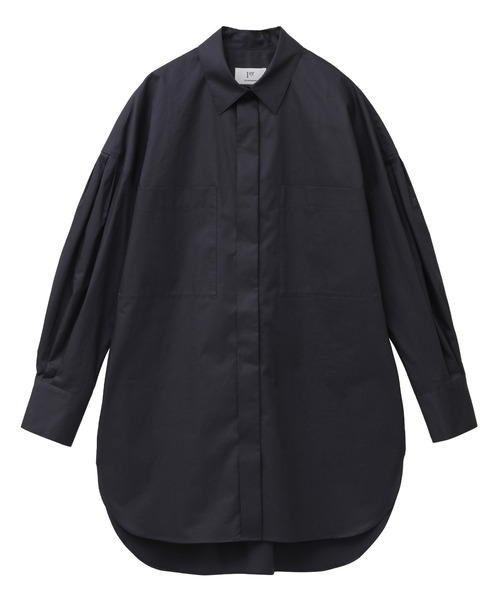 微光沢のある品の良いツイルのシャツ生地を使用したコンパクトシャツ。生地表面に光沢を出す加工を施し(チンツ加工)、最後にワッシャーをかけることでラフな風合いと程よい微光沢が出ます。こなれた風合いが出ているのが特徴です。袖山にタックを施すことでフォルム感が出て、凛としたモードなシャツに仕上がっています。【取り扱い】手洗い可