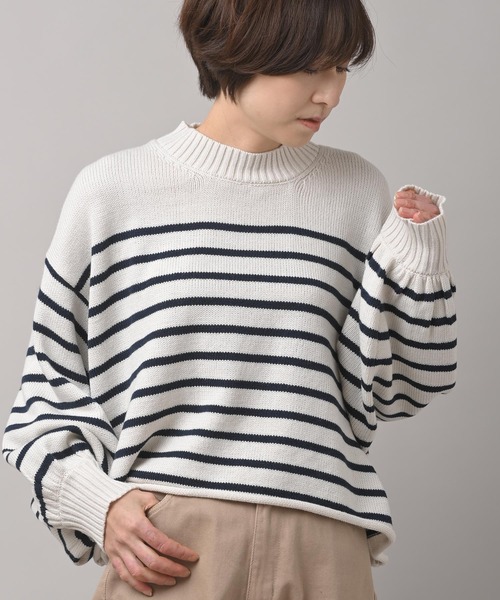 ボリューム袖が垢抜けするボーダーニットプルオーバー 長めのボリューム袖がこなれた雰囲気を作るニットプルオーバー。 落ち感のあるドロップショルダーもスタイリングを女性らしく演出します。 また身頃をショート丈にすることで袖デザインをよりアピール。 短いトップスは脚長効果も期待できます。 カジュアルからフェミニンまで幅広く着まわせる主張し過ぎないボーダー。 シンプルな着こなしもさりげないシャレ感の出るアイテムです♪ 裏地なし 伸縮性なし 薄手 編み加減や染めの具合でデザインやサイズ等異なる場合もございます 洗濯:手洗い可