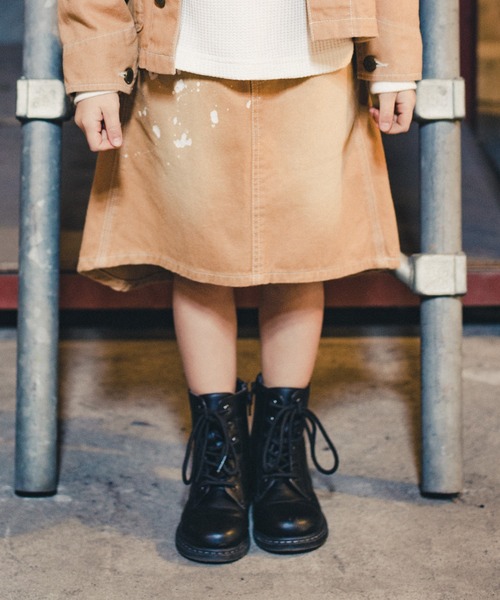 飛ばしペンキと加工感がアクセントとなるスカートです。スカートは前後差のあるデザインで特徴となります。▼セットアップ「ブルゾン」はこちら 飛ばしペンキカバーオール 41-1101-003