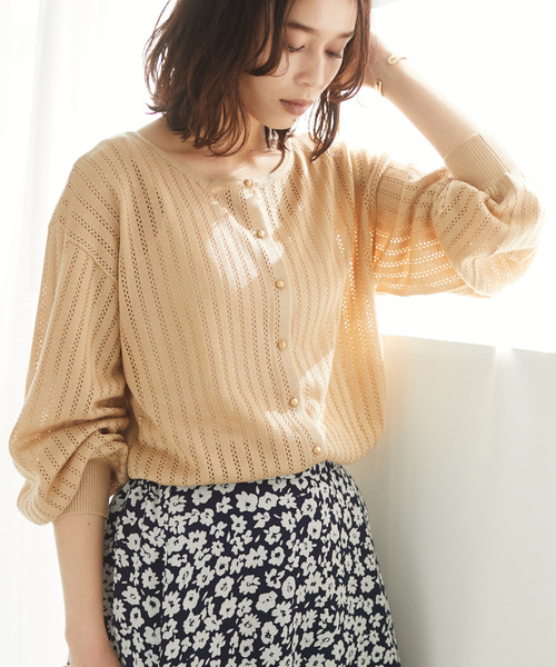 水洗いできるから毎日清潔◎前後2wayで着られてカーディガンにもプルオーバーにもなる!春夏の羽織ものとして重宝するカーディガン。透かし編み&前後2wayのデザインのこんなカーディガンなら、ただの羽織ものではなくおしゃれに合わせるアイテムとしても大活躍します!●こだわりポイント・透けすぎない透かし編み…肌が見えすぎないよう、程よくフェミニンに見える編地にこだわりました。・高見えするボタン…アンティーク調の小ぶり金ボタンを採用。光沢感の強すぎないゴールドで品よく。小ぶりで大人っぽく仕上げました。・丈感…ワンピースやスカート、ボリュームのあるパンツともバランスよくコーディネートできる、絶妙な丈感です。・袖シルエット…タイトすぎると肌の露出も気になるので、袖はふんわり。かわいさもUPさせました!【素材】透け:あり伸縮性:ややあり生地の厚さ:やや薄手光沢感:なし裏地:なしその他:滑らかな糸を使って編み上げているので、優しい肌触りです◎【着こなしのポイント】・パンツとも好相性。【BB15L0F0100<ベルト付>タックテーパードストレッチパンツ】【BB15L0F0200<ウエスト調整>ギャザーセミワイドパンツ】【裾 ゴム付 スカート見 え ギャザーワイドパンツ】・カーディガンとして羽織るなら、トレンドのシアー感のあるトップスと合わせても◎透け感がフェミニンなスタイルには、スカートを合わせてとことんフェミニンも、パンツを合わせてほんのりハンサムも、どちらもお似合い!・トップスとして着る際は、タンクトップやキャミソールをインナーにするのがおすすめです。● Green Parks ●(グリーン パークス)20以上の人気ブランドを取り扱うアパレルセレクトショップ。ベーシックながらもさりげなくトレンドを取り入れたオリジナルブランドchocol raffine robeも展開。▼ 商品のお気に入り登録がおすすめです ▼商品ページ内のハートマークをクリック。完売時の再入荷や、最後の1点の通知、コーディネート画像がアップされたとき、お得なお値下げの際の通知を受ける事ができます。【お知らせ】ページでも通知が確認できます。