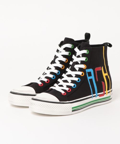 カラフルな配色がポップなハイカットスニーカー。 ブラックのキャンバス生地にビビッドカラーが配色された遊び心のある一足。 サイドのブランドロゴや4色のカラフルなハトメは、ASHらしいディティールにこだわったデザインに。 大人のコーデに、”ほどよい遊び”を入れるのにピッタリなアイテム。 デニムやスキニーと合わせてカジュアルに、スカートやワンピースにハズシアイテムとして合わせるのも◎ ■ソール、つま先、かかと部分にはヴィンテージ加工が施されております。 ■取り外し可能なカップインソールタイプ。