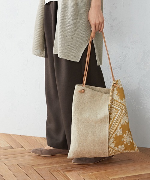 《デザイン》2種類の生地を組み合わせた、オシャレでコーディネートのアクセントになるトートバッグです。くたっとしたラフな印象のトートバッグは、旬なリラックス感のあるコーディネートにぴったりなアイテム。持ち手には、なめらかな表面感のフェイクレザーを使用して女性らしい細く華奢に仕上げました。とても軽量で、A4サイズや日傘などが入る使い勝手の良い大きさで、お出掛けにも、サブバッグとしてもおすすめです。《素材》太番手の素材を使用したナチュラルな印象の麻調素材と、スカーフのようななめらかな表面のバンダナ柄をプリントした素材を使用しています。《仕様》内装/ポケット×2《取り扱い》この商品は、染料の特性上、摩擦、水濡れにより色落ちします。特に、白っぽい生地の服装時にはご使用をお避け下さい。合成皮革部分は、汗、水、高温多湿に弱く、汗との摩擦によりまれに表面が劣化、色落ちする事が有ります。又、洗剤、シンナーなどを使用しますと、変色、剥離の原因となります。ご注意下さい。※画像の商品はサンプルとなりますので実際の商品と仕様、加工、サイズが若干異なる場合がございます。※こちらの商品はFIVE FOXes独自の採寸方法となっています。本サイトのサイズガイドと採寸方法が異なる場合がありますのでご了承ください。