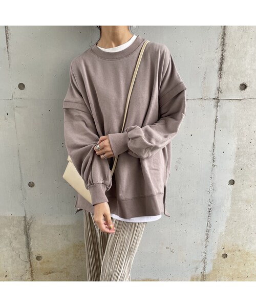 くすみカラーとボリューム袖が可愛い裏起毛スウェット。 袖切り替えデザインがポイントで、たっぷりのボリュームスリーブがとにかく可愛いシルエット。 オーバーサイズにサイドスリットデザインなので、デニムやプリーツパンツはもちろんスカート合わせもおすすめ! 簡単にレイヤードスタイルが完成するアイテムです☆ ※モデル身長:161㎝ ■カラー グレージュ ■サイズ M:着丈:70/76㎝、肩幅:68㎝、身幅:128㎝、袖丈:47㎝ ※※多少の誤差は予めご了承ください。 ◾️素材 ポリエステル 65% 綿 35%