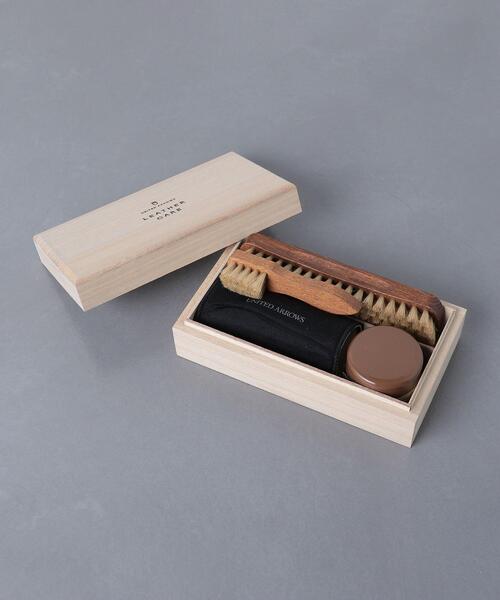 ロゴ入りのオリジナル木箱に入ったシューケアキットです。 スムースレザーに光沢と栄養を与えるクリームと、ウェルトブラシ、シューズブラシ、グローブクロスがセット内容に。 基本のお手入れ方法を記載した説明書付きのため、ビギナーの方にもおすすめです。 インテリアとしても見映えする、高級感のあるデザインも魅力のひとつです。 店舗へお問い合わせの際は、全国のUNITED ARROWS各店舗まで下記の品名/品番をお申し付け下さい。 品名:UA Shoe Shine Care Set 品番:13485990943