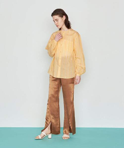 程よい透け感が女性らしい印象のノーカラーのシャツブラウス。 イタリアNALYA社の上質な混紡素材を使用し、オーロラのラメ糸が引き立つマルチストライプ柄。 バックスタイルはヨークをボーダー柄へ切り替えたデザインがポイント。 すっきりとした身頃とボリューム感のある袖とのバランスも魅力です。 【生地感】 -------------------------- 裏地:なし 透け感:あり 生地の伸び:なし 光沢感:ややあり -------------------------- ※ ご自宅でのお洗濯の際は、洗濯表示を必ずご確認ください。 店舗へお問い合わせの際は、全国のUNITED ARROWS各店舗まで下記の品名/品番をお申し付けください。 品名:AM RAME STRP VLM/SL 品番:87212630023